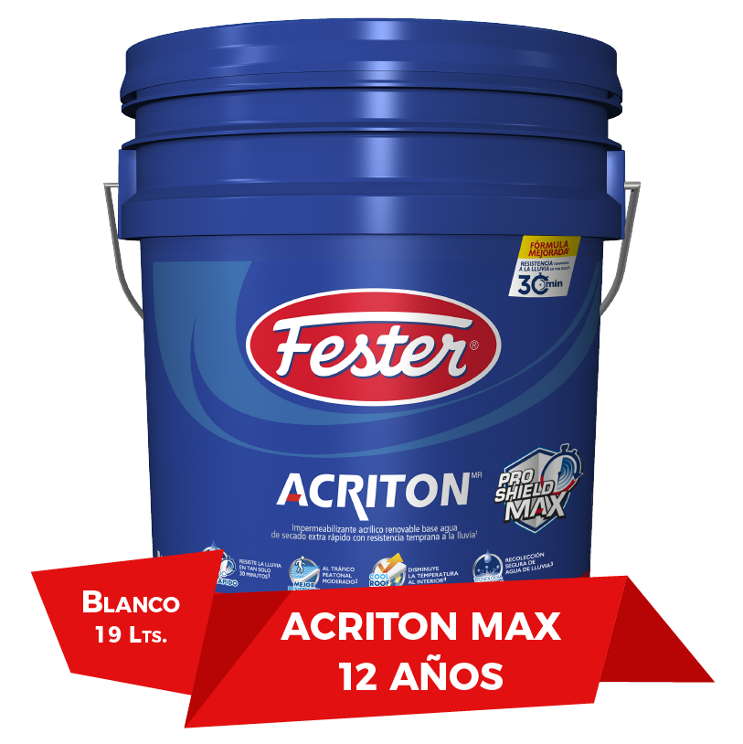 Fester 19 Litros Acriton 12 años Blanco es un impermeabilizante elastomérico fibratado de última generación que logra el mejor balance de propiedades mecánicas como son: la elongación, tensión y resistencia al desgaste; además de secado extra rápido, dando ventajas únicas en el mercado para poder hacer la impermeabilización completa en una mañana y ofrecer la mayor durabilidad.