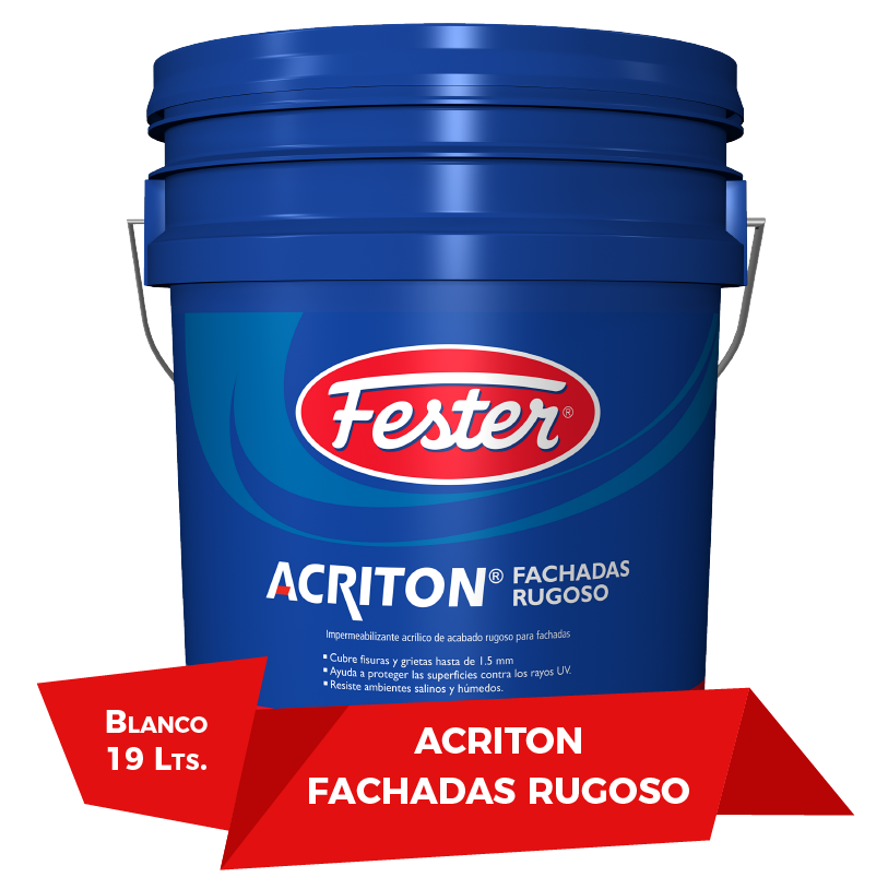 Fester Impermeabilizante Acriton Fachadas Rugoso es un acrílico base agua, elaborado con resinas 100% acrílicas, pigmentos inorgánicos, agregados minerales y aditivos de primera calidad. Diseñado con la viscosidad ideal para aplicarse sobre muros y fachadas.
