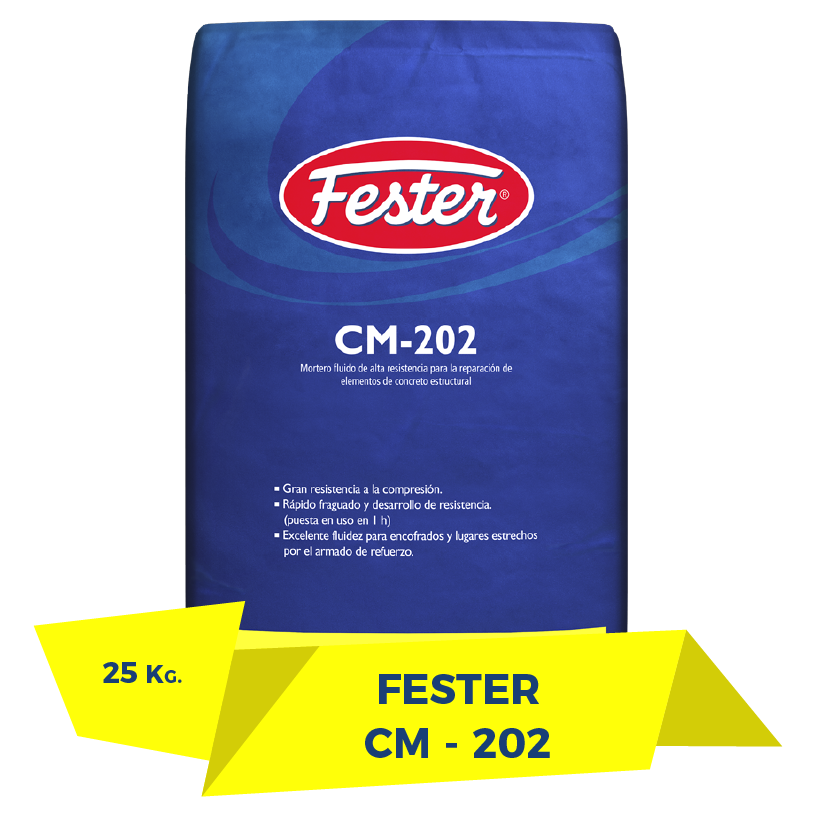 Fester CM-202 reparador es un mortero fluido de alta resistencia para la reparación de elementos de concreto, elaborado a base de cemento hidráulico, aditivos especiales y granulometría controlada, diseñado para reparaciones de alta resistencia en el concreto estructural o no estructural, en posición horizontal, vertical o inclinada.