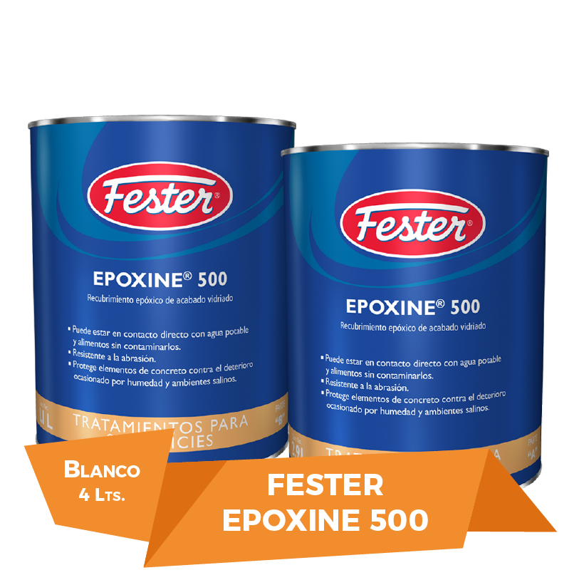 Fester Epoxine 500 Blanco se usa para recubrir y lograr acabado liso brillante en pisos, muros y losa de cisternas para agua potable, albercas, espejos de agua, depósitos de distribución de agua, silos para granos, depósitos de concreto en general, pisos, muros en áreas sépticas, tuberías o ductos de concreto y mas.