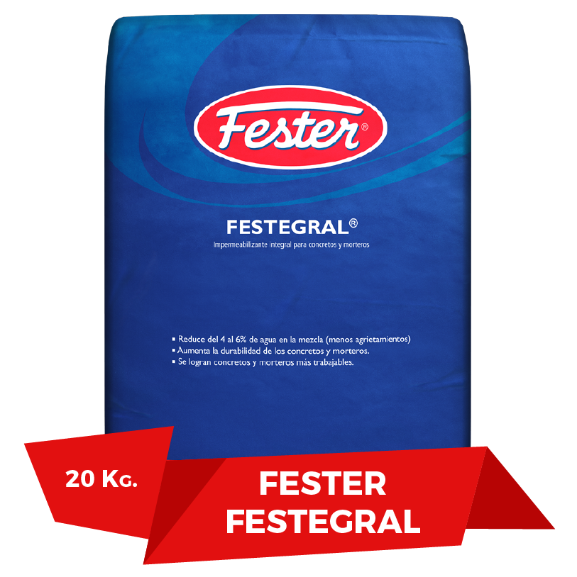 Impermeabilizante Fester Festegral es un producto en polvo finamente molido, de color gris claro, contiene sales de ácidos grasos que favorecen la reducción de la permeabilidad en concretos y morteros, sin disminuir la resistencia a la compresión.