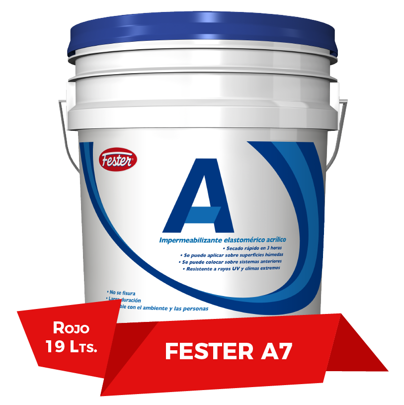 Impermeabilizante Fester A7 Rojo elastomérico elaborado a base de polímeros acrílicos, pigmentos inorgánicos, agregados minerales y aditivos especiales.