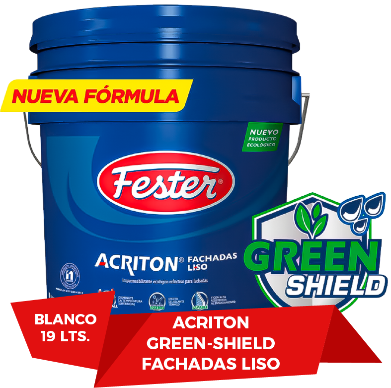 Fester Acriton Green Shield Fachadas Liso 19 litros es un impermeabilizante acrílico con base de agua, elaborado con resinas 100% acrílicas, pigmentos inorgánicos, agregados minerales y aditivos de primera calidad. Diseñado con la viscosidad ideal para aplicarse sobre muros y fachadas.