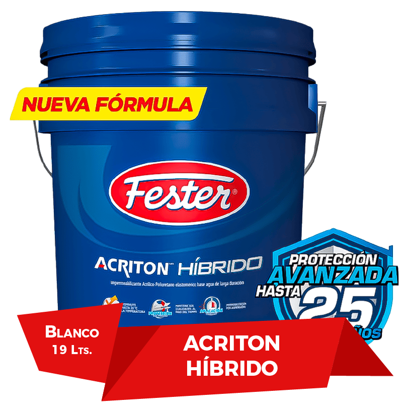 Fester Acriton Hibrido Cubeta es un impermeabilizante acrílico-poliuretano elastomérico base agua de larga duración. Protege techos y laminas industriales, centros comerciales, complejos logisticos, entre otros. Ofrece una garantia hasta por 25 años debido a su tecnologia de ultima generación. Para mejores resultados de adherencia y rendimiento le recomendamos usar Fester Acriton Sellador
