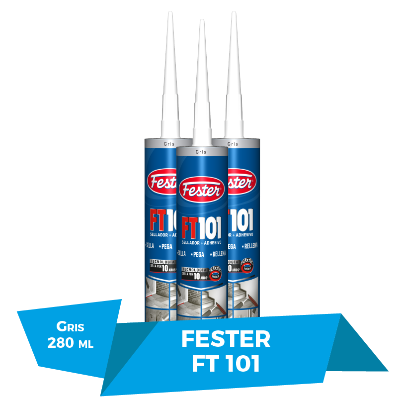Fester Sellador FT101 Gris elástico y adhesivo multipropósito que está indicado para el sellado y pegado en materiales de construcción sujetos a movimientos moderados. Instalación de techos de lámina, marcos, tableros, láminas, peldaños, conductos eléctricos, plomería, conductos de ventilación, tejas, canales de desagüe, unión de mampostería y estructura metálica, muebles de madera, entre muchas aplicaciones más.